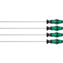 Juego de destornilladores de 4 piezas de Wera. Con varilla extra-larga para entornos de montaje profundos y de alcance difícil. Con un mango Kraftform multicomponente para un trabajo rápido y ergonómico. Kraftform Plus: las zonas duras de agarre permiten una gran velocidad de trabajo mientras que las zonas blandas de agarre garantizan la transmisión de altos pares de giro. Con función de retención: gracias a la fuerza de apriete que resulta de la fuerza de presión superficial entre la punta de salida y el perfil del tornillo, los tornillos se mantienen de forma segura en la herramienta. Lleva la marcación correspondiente en el mango para encontrar y clasificar los útiles más fácilmente.