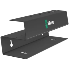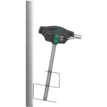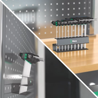 Incluye un soporte metálico para un alojamiento ordenado y manejable en el taller. El soporte puede ser colocado en el banco de trabajo o colgado en la pared de las herramientas. Al estar montado en la pared, el soporte dispone de una inclinación que facilita la extracción de los destornilladores con mango en "T". Así, los mangos en "T" no quedan atrapados por la pared.