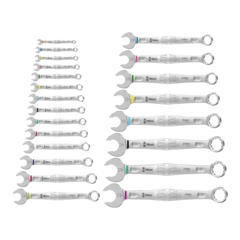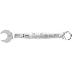 Por el hecho de que en los trabajos de uniones atornilladas los espacios de montaje son cada vez más estrechos es necesario que los usuarios dispongan de herramientas con las cuales también puedan trabajar de forma exitosa en estas situaciones. En entornos estrechos se necesitan puntos adicionales en los cuales se pueda reposicionar la herramienta. ¿Entonces, será posible modificar las llaves de boca de tal manera que aumenten las posibilidades de reposicionamiento de la herramienta? Por medio de la combinación de la boca que se encuentra girada en un ángulo de 7,5° y la geometría del doble hexágono, se logra una duplicación de los puntos de posicionamiento de la herramienta al atornillar. Al girar la llave de forma repetida en 180° por su eje longitudinal durante la acción de atornillar se dan cuatro posibilidades, y así las tuercas y los tornillos pueden accionarse cada 15°. De esta forma, la Joker 6003 con su geometría de boca tan ingeniosa amplía el espectro de aplicaciones en espacios estrechos de una manera importante. La Joker 6003 prácticamente encuentra el punto correspondiente de posicionamiento autónomamente después de cada giro de la herramienta. El lado anular es delgado pero sin embargo muy robusto y se encuentra doblado en un ángulo de 15° con relación al eje del útil. El acabado de la superficie de alta calidad garantiza una protección anticorrosiva efectiva y duradera. Lleva el sistema de búsqueda de la herramienta Take it easy: con marcas a color según el tamaño. Los bolsos de la Joker llevan un sistema de adherencia autoadhesiva en su lado posterior para que se puedan depositar de forma fácil en la pared, la estantería o el carro de las herramientas en el taller, o para conectarlas con el sistema de transporte Wera 2go.