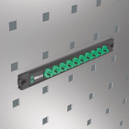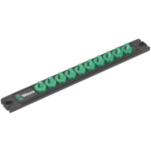 1 listón magnético, vacío. Adecuado para hasta 10 llaves de vaso y/o vasos de punta con arrastre de 1/4". El listón magnético permite una colocación temporal en superficies metálicas, y gracias a la función Twist to unlock ("gira y desbloquea"), se dispone de un bloqueo y desbloqueo seguro de los vasos.