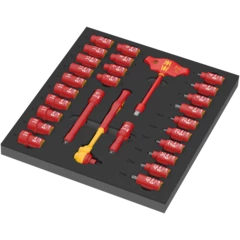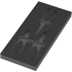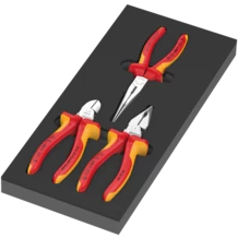Un depósito de espuma resistente; con aspecto bicolor para reconocer rápidamente si faltan piezas; adecuado para el carro de herramientas para el taller Tool Rebel; viene con 1 alicate de fuerza de corte diagonal KNIPEX, 1 alicate semi-redondo con filo KNIPEX, 1 alicate combinado en punta KNIPEX; cada alicate está aislado mediante camisas multicomponentes, probadas según VDE.