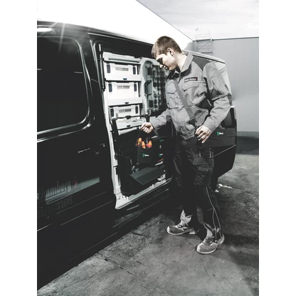 El material robusto y estable en su forma se caracteriza por una alta resistencia contra cortes y punzadas. Protege las herramientas transportadas contra daños y humedad. La caja ofrece una gran durabilidad.