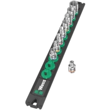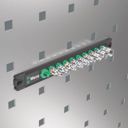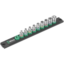 Listón magnético de vasos con 9 llaves de vaso manuales y mecánicas (no de impacto), de 1/4". Un mecanismo giratorio suave permite el alojamiento seguro y la fácil extracción de los vasos. Lleva el sistema de búsqueda de herramientas Take it easy con marcas de colores según el tamaño, lo cual permite encontrar la herramienta precisa de forma rápida y fácil. El listón magnético permite la colocación temporal en superficies metálicas, y gracias a la función Twist to unlock ("gira y desbloquea"), además es posible bloquear y desbloquear los vasos de manera segura.