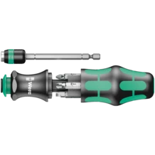 Las herramientas compactas de Wera permiten la utilización simultánea de las dos clases de atornillar "manual" y "mecánica". El sistema de cambio, de geometría muy compacta, de mango y varilla con diferentes puntas de la varilla en un espacio mínimo, le proporcionan al usuario una enorme movilidad y flexibilidad. Adecuadas para puntas de arrastre hexagonal exterior de 1/4" según la norma DIN ISO 1173-C 6,3 y E 6,3 (ISO 1173) así como para las series de conexión de Wera 1 y 4. Con pieza de conexión, bayoneta, tecnología Rapidaptor. Mango Kraftform con sistema anti-rodamiento y multicomponente, para un trabajo de atornillar especialmente ergonómico. Dispone de un depósito integrado para alojar las puntas. La varilla tipo bayoneta es retractible dentro del mango, lleva el sistema de cambio rápido, y permite una utilización manual rápida incluso en situaciones de trabajo muy estrechas cuando la varilla se encuentra retraída. Por medio del simple accionamiento del manguito de bloqueo, la varilla vuelve a salir del mango. Ahora, el porta-bayonetas se puede utilizar como un destornillador plenamente válido. La varilla tipo bayoneta se puede extraer y utilizar como adaptador para la máquina, o también se puede volver a llevar a su posición de salida. Con un bolso práctico para llevar en el cinturón.