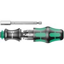 Herramienta compacta de Wera con un mango multicomponente tipo Kraftform para altas velocidades de apriete y desapriete así como un trabajo en uniones atornilladas especialmente ergonómico. El mango incluye un almacen de puntas que está integrado en el grifo y en el cual se pueden alojar 6 puntas. La varilla tipo bayoneta es retractable en el caso de que se den situaciones de montaje de gran estrechez. Si se quiere utilizar la máquina atornilladora, la varilla también se puede extraer. Con potente imán permanente para una sujección segura del tornillo.