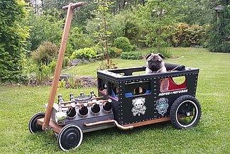 Uno de los ganadores que convenció al jurado es el “Carlino Motorizado“ de Thomas Voigt de la ciudad de Buchholz. El motor estilizado de este vehículo ofrece en sus cilindros espacio para 8 botellas de cerveza. El “habitáculo“ ofrece espacio para dos cajas de cerveza, y además – muy importante – para el perro del constructor – un carlino. La carretilla con el nombre “Pocket Bike“ de Benjamin Böttcher de la ciudad de Schmölln, es otro ejemplar increíblemente espectacular. La máquina tractora lleva un motor de gasolina dentro de una caja de cerveza que al mismo tiempo sirve de puesto de conductor. En cada uno de los dos remolques mono-eje de este tren tractor hay espacio para otra caja de cerveza más. Los acompañantes que van en los remolques pueden apoyar los pies en unos estribos laterales. Desafortunadamente, no tenemos conocimiento de la velocidad tope que alcanza esta carretilla motorizada. Fuera de la técnica tan impresionante, el jurado quedó encantado del inmenso emblema “Tool Rebel“ que lleva el segundo remolque en su parte trasera.