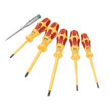 Juego de destornilladores de alta calidad Kraftform VDE. Mango Kraftform multicomponente para un trabajo rápido y confortable. La punta Wera Black Point así como un proceso de endurecimiento sofisticado garantizan una larga durabilidad de la punta, además una mayor protección anticorrosiva y gran exactitud de ajuste. Han sido probados en un 100 % a 10.000 voltios para un trabajo seguro bajo la tensión máxima permitida de 1.000 voltios. El sistema hexagonal anti-rodadura en el mango evita que la herramienta ruede del puesto de trabajo. Marcación en el mango para encontrar y ordenar la herramienta más fácilmente. 1 buscapolos monofásico.