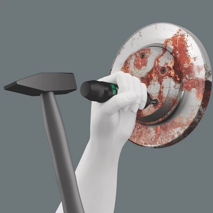 Tiene que ser posible aflojar cualquier tornillo, aunque esté tremendamente agarrotado. Los destornilladores de golpe son la solución para aquellos casos en los cuales no alcanza la fuerza manual y no se tiene a diposición una máquina neumática. El destornillador de golpe de Wera dispone de un grado de efectividad especialmente alto gracias a su construcción de doble curva: la fuerza del golpe es transformada en un movimiento de giro. Así se evita tener que utilizar máquinas de aire comprimido.