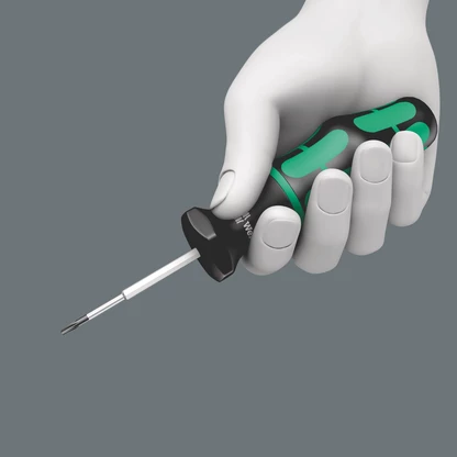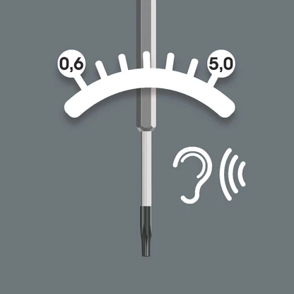 Los destornilladores indicadores de par de Wera, cuando salen de fábrica vienen preajustados en los valores de par de apriete que recomiendan los productores de plaquitas de metal duro más importantes. Estos pares de apriete, en el caso de los tornillos TORX®, TORX PLUS® y de hexagonal interior, corresponden con el tamaño respectivo del tornillo. Los destornilladores indicadores de par permiten que las uniones atornilladas estén apretadas de forma segura, y también que se puedan aflojar más fácilmente. Una precisión de ± 10 %