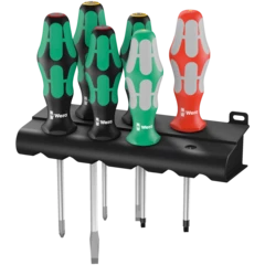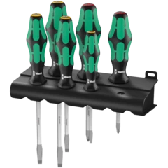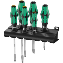 Juego de destornilladores de 6 piezas con mango Kraftform Plus que permite un trabajo agradable y ergonómico sin que se formen ampollas o callosidades. Las zonas duras de agarre permiten una gran velocidad de trabajo mientras que las zonas blandas de agarre garantizan la transmisión de altos pares de giro. La punta Lasertip se aferra fuertemente a la cabeza del tornillo y evita así que involuntariamente ocurra un deslizamiento del útil. Por medio de la varilla hexagonal y la llave auxiliar hexagonal que lleva integrada se pueden transmitir mayores pares de giro con ayuda de llaves de boca o de anillo. Con sistema de búsqueda de herramienta Take it easy: marcas de color según el perfil y sellos con el tamaño. El sistema de protección contra el rodamiento mediante hexágono evita las molestias que conlleva el perder la herramienta que se rueda en el puesto de trabajo. Incluye una bandeja práctica para depositar los destornilladores de forma sistemática y ordenada.
