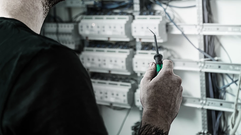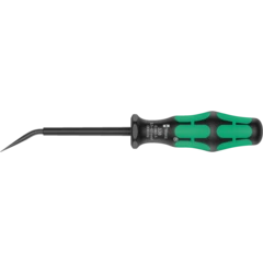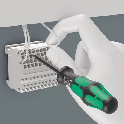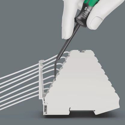 Los bornes en línea sostienen los extremos de los cables de forma mecánica. En el caso de los bornes de muelle, la fuerza necesaria proviene de un muelle. Este muelle tiene que ser abierto con ayuda de una herramienta para poder introducir los extremos del cable. Las herramientas esenciales de accionamiento de Wera permiten el trabajo en los bornes de muelle, incluso en espacios de montaje muy estrechos dentro de armarios de distribución. Gracias a la varilla doblada es posible acceder incluso a aquellos bornes de muelle que normalmente no son accesibles por medio de varillas rectas.