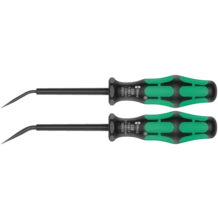 Un juego con 2 herramientas de accionamiento para bornes de muelle. Gracias a las varillas dobladas es posible trabajar de forma exitosa incluso en bornes de muelle dentro de armarios de distribución que normalmente con una varilla recta no serían accesibles. La varilla queda apretada dentro del borne así que las dos manos quedan libres para poder introducir el cable. Dispone de un mango Kraftform multicomponente que permite un trabajo rápido y ergonómico.