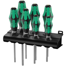 Juego de destornilladores de 7 piezas para tornillos TORX®. Con un mango Kraftform multicomponente para un trabajo rápido y ergonómico. Con función de retención: gracias a la fuerza de apriete que resulta de la fuerza de presión superficial entre la punta de salida y el perfil del tornillo, los tornillos se mantienen de forma segura en la herramienta. El sistema de protección contra el rodamiento evita las molestias que conlleva el perder la herramienta que se rueda en el puesto de trabajo. Lleva la marcación en el mango para encontrar y clasificar los útiles más fácilmente.