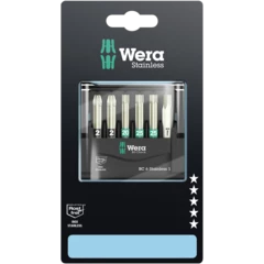 Juego de llaves acodadas de alta calidad de acero inoxidable para tornillos de hexágono interior de Wera. El acero inoxidable evita el contagio con la herrumbre de origen externo. Hex-Plus ofrece mayores superficies de apoyo dentro de la cabeza del tornillo. Así se reduce a un mínimo el efecto de entalladura y la destrucción de la cabeza del tornillo se evita casi por completo. Con cabeza esférica de hexágono en el brazo largo: gracias a los perfiles esféricos de salida es posible desviar o girar el eje de la herramienta hacia el eje del tornillo. De esta forma se pueden realizar trabajos de atornillar "doblando la esquina". Con sistema de búsqueda de herramienta Take it easy: marcas de color según el tamaño. El juego se ofrece en el práctico clip de material resistente que es prácticamente libre de desgaste.