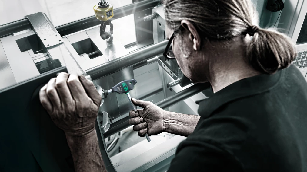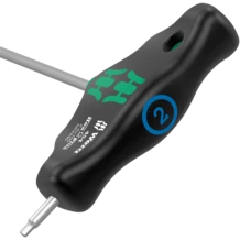 Destornillador de mango en "T": La forma ideal del agarre permite la transmisión de pares de apriete y desapriete especialmente altos. La forma ergonómica del mango rellena la palma de la mano de forma perfecta, los dedos de la mano se depositan de forma segura en las cavidades del mango. Así, toda la mano se encuentra en contacto con el mango y de esta manera se evitan pérdidas friccionales entre la mano y el mango. La superficie del útil ha recibido un tratamiento especial para garantizar una alta protección anticorrosiva y un posicionamiento óptimo dentro del tornillo.
