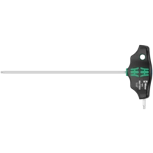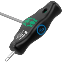 Destornillador de mango en "T": La forma ideal del agarre permite la transmisión de pares de apriete y desapriete especialmente altos. La forma ergonómica del mango rellena la palma de la mano de forma perfecta, los dedos de la mano se depositan de forma segura en las cavidades del mango. Así, toda la mano se encuentra en contacto con el mango y de esta manera se evitan pérdidas friccionales entre la mano y el mango. La superficie del útil ha recibido un tratamiento especial para garantizar una alta protección anticorrosiva y un posicionamiento óptimo dentro del tornillo.