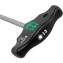 Destornillador de mango en "T": La forma ideal del agarre permite la transmisión de pares de apriete y desapriete especialmente altos. La forma ergonómica del mango rellena la palma de la mano de forma perfecta, los dedos de la mano se depositan de forma segura en las cavidades del mango. Así, toda la mano se encuentra en contacto con el mango y de esta manera se evitan pérdidas friccionales entre la mano y el mango. La superficie del útil ha recibido un tratamiento especial para garantizar una alta protección anticorrosiva y un posicionamiento óptimo dentro del tornillo.