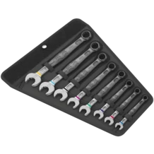 Por el hecho de que en los trabajos de uniones atornilladas los espacios de montaje son cada vez más estrechos es necesario que los usuarios dispongan de herramientas con las cuales también puedan trabajar de forma exitosa en estas situaciones. En entornos estrechos se necesitan puntos adicionales en los cuales se pueda reposicionar la herramienta. ¿Entonces, será posible modificar las llaves de boca de tal manera que aumenten las posibilidades de reposicionamiento de la herramienta? Por medio de la combinación de la boca que se encuentra girada en un ángulo de 7,5° y la geometría del doble hexágono, se logra una duplicación de los puntos de posicionamiento de la herramienta al atornillar. Al girar la llave de forma repetida en 180° por su eje longitudinal durante la acción de atornillar se dan cuatro posibilidades, y así las tuercas y los tornillos pueden accionarse cada 15°. De esta forma, la Joker 6003 con su geometría de boca tan ingeniosa amplía el espectro de aplicaciones en espacios estrechos de una manera importante. La Joker 6003 prácticamente encuentra el punto correspondiente de posicionamiento autónomamente después de cada giro de la herramienta. El lado anular es delgado pero sin embargo muy robusto y se encuentra doblado en un ángulo de 15° con relación al eje del útil. El acabado de la superficie de alta calidad garantiza una protección anticorrosiva efectiva y duradera. Lleva el sistema de búsqueda de la herramienta Take it easy: con marcas a color según el tamaño. Los bolsos de la Joker llevan un sistema de adherencia autoadhesiva en su lado posterior para que se puedan depositar de forma fácil en la pared, la estantería o el carro de las herramientas en el taller, o para conectarlas con el sistema de transporte Wera 2go.