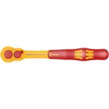 Carraca Zyklop VDE con palanca de conmutación en el diseño inconfundible de Wera. Su forma es muy delgada lo que permite trabajar de forma cómoda incluso en espacios de montaje sumamente estrechos. Gracias a su dentado fino de 80 dientes se consigue un ángulo de recuperación de tan solo 4,5°. Dispone de una palanca de conmutación que permite un cambio del sentido de giro muy cómodo. Los vasos quedan sujetados de forma segura por medio de una función de bloqueo y desbloqueo por pulsador. La herramienta ha sido probada individualmente pieza por pieza según la norma IEC 60900 a 10.000 voltios para garantizar un trabajo seguro bajo la tensión permitida de hasta 1.000 voltios.