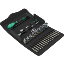 Juego de carraca de 28 piezas, de 1/4", llaves de vaso en tamaños métricos. 1 carraca Zyklop Comfort con palanca de reenvío, un dentado fino de 80 dientes, un ángulo de retorno pequeño de tan solo 4,5°; 9 llaves de vaso Zyklop con el sistema de búsqueda de herramientas Take it easy: unas marcas a color según el tamaño, y además indicaciones del tamaño grabadas a láser, para encontrar la herramienta precisa de forma rápida; 1 prolongación Zyklop (de 150 mm) con manguito de giro rápido para un movimiento de giro superrápido, 1 prolongación "Wobble" con un ángulo de ladeo de 15° en todas las direcciones, 1 adaptador de puntas (de cuadradillo interior de 1/4" a hexágono interior de 1/4"), 15 puntas, resistentes y duras, para el uso universal. 1 caja textil robusta diseñada de forma compacta para un alojamiento que ahorra espacio; el material de la caja, estable y ligero a la vez, reduce el peso del conjunto - perfecto para trabajos externos.
