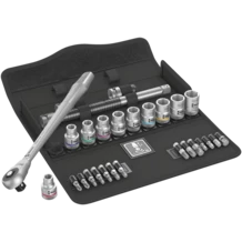 Una configuración del juego increíblemente compacta que ofrece muchísima herramienta en muy poco espacio. Se obtiene una sensación completamente nueva con relación a esta clase de juegos de carraca gracias, a las novedosas cajas de material textil sumamente robustas y duraderas que además se pueden posicionar de forma vertical para conseguir un mayor orden en la estantería del taller. El material exterior textil de la caja ofrece además una protección adicional de las superficies. Peso y volumen son mínimos lo que facilita la movilidad para el usuario. Con sistema de búsqueda de herramienta Take it easy: marcas de color según el tamaño.