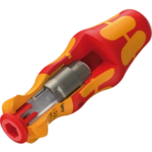 Porta-varillas para varillas intercambiables Kraftform Kompakt VDE de Wera con una carraca de dentado fino integrada en el mango (40 dientes/ángulo de retorno de 9°). La carraca acelera el trabajo de atornillar sin tener que volver a reposicionar el útil constantemente de manera trabajosa. El mecanismo de carraca que se encuentra completamente integrado en el mango, permite un trabajo práctico y sumamente agradable. El sistema de cambio de mango y varillas intercambiables permite un cambio ultrarrápido de la varilla precisa, y de esta manera ofrece múltiples aplicaciones.