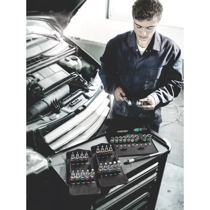 Vaso de punta con arrastre de 3/8" y función de sujeción para un trabajo de atornillar especialmente cómodo y con un riesgo reducido de que se pierda el tornillo al llevarlo hacia la pieza. El sistema de búsqueda rápida de la herramienta Take it easy, con marcas a color según el perfil, permite encontrar la herramienta precisa rápidamente.