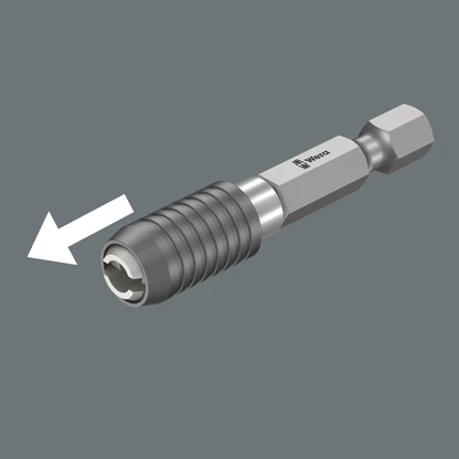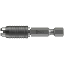 Para una conexión fija, libre de movimientos, entre el porta-puntas y la punta, que se puede volver a soltar de manera rápida. Simplemente desplazar el manguito hacia adelante y cambiar la punta. En versión magnética para un mejor posicionamiento de los tornillos.