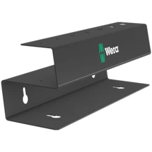 Soporte metálico para destornilladores en T. Este soporte se puede o colocar encima del banco de trabajo, o colgar en la pared de los útiles. Adecuado para hasta 7 destornilladores TORX® de mango en T de Wera.