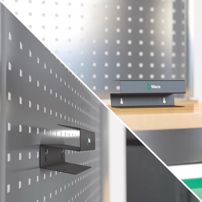 Soporte metálico para un alojamiento ordenado y manejable en el taller. El soporte puede ser colocado en el banco de trabajo o colgado en la pared de las herramientas. Al estar montado en la pared, el soporte dispone de una inclinación que facilita la extracción de los destornilladores con mango en "T". Así, los mangos en "T" no quedan atrapados por la pared.
