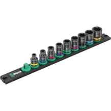 Listón magnético de vasos con 9 llaves de vaso Impaktor para el uso con atornilladoras eléctricas o de aire comprimido con arrastre de 3/8". La tecnología Impaktor permite unos tiempos de servicio por encima del promedio, incluso bajo cargas extremas. El perfil hexagonal que se utiliza permite una alta transmisión de la fuerza, y al mismo tiempo una gran precisión, sin deteriorar el perfil. Lleva el sistema de búsqueda de herramientas Take it easy con marcas a color según el tamaño - para encontrar la herramienta precisa de manera fácil y rápida. El listón magnético permite la fijación temporaria en superficies metálicas, y dispone - gracias a la función "Twist to unlock" - de un bloqueo y un desbloqueo seguro de los vasos.
