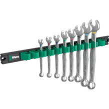 Juego de llaves de boca y anillo, de 8 piezas, medidas en pulgadas; en un listón de muelles. Gracias a la combinación de la boca doblada en un ángulo de 7,5° y la geometría de doble hexágono, la llave Joker 6003 logra una duplicación de los puntos de posicionamiento inicial. Al darle la vuelta a la llave de forma reiterada en 180° a lo largo de su eje longitudinal durante el trabajo de atornillar, se dan cuatro posibilidades de posicionamiento, y las cabezas de los tornillos y las tuercas se pueden agarrar cada 15°. De esta forma es mucho más fácil atornillar dentro de espacios de montaje estrechos. El lado del anillo es delgado, pero sin embargo muy robusto, y está dobaldo en un ángulo de 15° hacia el eje del útil. Gracias a la bonificación de alta calidad de la superficie, se consigue una protección anticorrosiva muy alta y sostenible. Lleva el sistema de búsqueda de herramientas Take it easy: con marcas a color según el tamaño. Los muelles de sujeción que integra el listón permiten un alojamiento perfecto y seguro de los útiles. Gracias al fuerte imán que lleva, el listón se mantiene de forma segura en superficies metálicas. De forma alternativa, el listón también se puede atornillar en la pared.