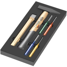 Un depósito de espuma de larga duración; el aspecto bicolor hace que se reconozca muy rápidamente si hacen falta piezas; es adecuado para el carro de herramientas del taller Tool Rebel; viene con 1 martillo de cerrajero de PICARD®, 4 punzones de chaveta exclusive de RENNSTEIG así como 1 cincel plano de RENNSTEIG.
