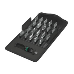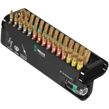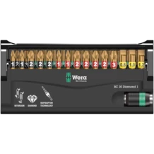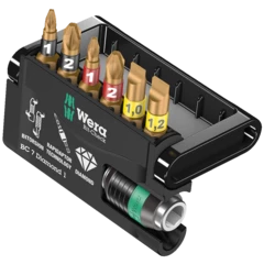 Puntas con partículas diminutas de diamante en sus extremos. Estas partículas proporcionan un alojamiento seguro dentro del tornillo, reducen la presión de prensado necesaria, y disminuyen el riesgo de que la herramienta se resbale del tornillo. Se trata de puntas BiTorsion con una zona de torsión a la cual se deriva la energía cinética en el caso de que aparezcan picos de carga. Así aumenta la longevidad del producto de forma importante. Disponen de la tecnología Rapidaptor que permite la inserción de las puntas incluso sin utilizar el manguito. La desconexión de la punta se realiza por medio de un desplazamiento simple hacia adelante - para un cambio de puntas ultrarrápido, incluso con una sola mano. Son adecuadas para la inserción en la máquina destornilladora o para conectarlas con el portabrocas del taladro electrónico. El Bit-Check multicomponente convence por su peso ligero y sus dimensiones extremamente compactas. El material blando en la parte baja del Bit-Check permite un alojamiento seguro de la herramienta en la caja, y al mismo tiempo facilita su extracción. El perfil y el tamaño de las puntas son fácilmente reconocibles gracias al sistema de búsqueda fácil Take it easy con sus codificaciones a color y su letra claramente visible.
