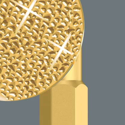 Las partículas minúsculas de diamante que se encuentran en el extremo de la punta, en el proceso de atornillado es como si se aferraran con los dientes en el tornillo. A causa de este alojamiento seguro del útil, ya no hace falta tener que aplicar tanta presión al efectuar el atornillado. Así se reduce el riesgo de que la herramienta se escape del tornillo por deslizamiento.