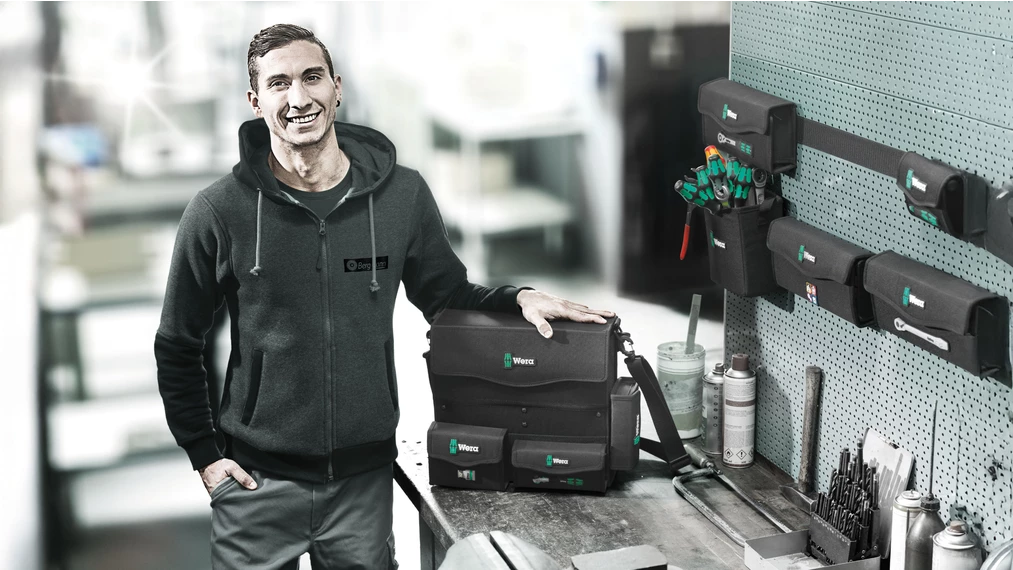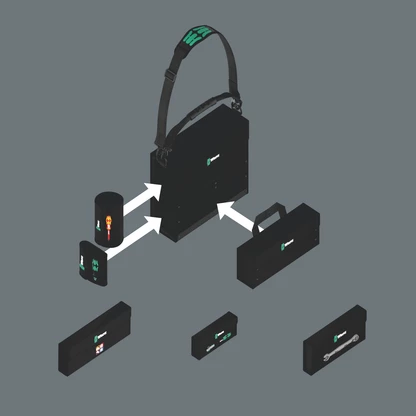 También es idealmente apto para acoplar las cajas y los bolsos de material textil de Wera que llevan una zona de conexión autoadhesiva