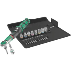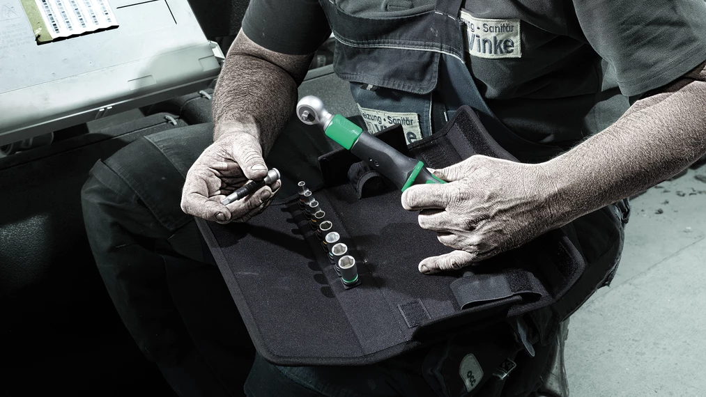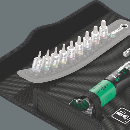Juego de llave dinamométrica de 1/4" de 10 piezas en un estuche robusto de material textil; la llave dinamométrica viene con mecanismo de sobre-resbalo. Tan pronto se alcanza el valor de par de giro preajustado la herramienta no puede ser utilizada para apretar de manera forzada. Así queda excluido que se aplique un valor de par demasiado alto. Área de medición de 2 a 12 Nm para un apriete controlado hacia la derecha y la izquierda. Un ajuste y un aseguramiento fácil del valor de preajuste: con el encastre audible y palpable cuando se alcanzan los valores de escala, se facilita de forma adicional el ajuste seguro del valor dinamométrico deseado. Con la función Torque Lock para usarla como carraca estándar sin función dinamométrica. De esta forma también puede utilizarse para aplicaciones de ángulos giratorios. Dispone del valor máximo de rotura del cuadradillo de ¼" según DIN 3122. El ángulo de retorno es de tan solo 5°, así que la carraca también puede ser utilizada en situaciones de trabajo de gran estrechez. El juego contiene: Llave dinamométrica Safe-Torque A 1, de cuadradillo de 1/4", de 2-12 Nm, 8 vasos con arrastre de 1/4" y 1 prolongación corta.