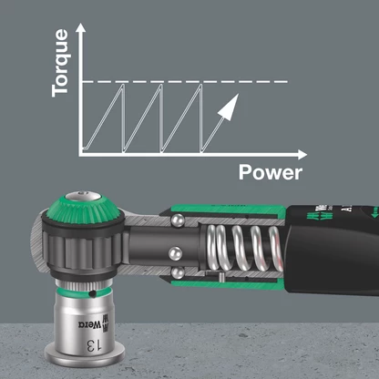 La llave dinamométrica Safe-Torque dispone de un dentado fino de 72 dientes y tiene un ángulo de retorno de tan solo 5°. Esta carrera tan pequeña permite un trabajo rápido y preciso en cualquier situación de montaje.