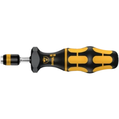Destornillador dinamométrico de Wera. El mango es tipo Kraftform de pistola para una transmisión de la fuerza especialmente alta. El mango es multicomponente y permite así unas velocidades de trabajo especialmente altas y un trabajo sumamente ergonómico. Con un valor del par dinamométrico fijamente preajustado de fábrica según el deseo del cliente. Adecuado para todas aquellas aplicaciones en las cuales es necesario que se tenga un valor del par constantemente igual y en los que se requiera una alta exactitud repetitiva. El valor del par de apriete se puede modificar dentro del área de medición con una herramienta adicional (el juego de recalibración es obtenible bajo el número de código 05137002001). Luego, el valor ajustado ha de verificarse con ayuda de un aparato corriente de medición del par de giro. Se tiene un par de desapriete ilimitado para poder soltar tornillos agarrotados. Se dispone de la tecnología Rapidaptor - el sistema de cambio rápido para un cambio superveloz de las puntas. Adecuado para puntas con arrastre de hexágono exterior de 1/4"según la norma DIN ISO 1173-C 6,3 y E 6,3 (ISO 1173). El mango tipo Kraftform es multicomponente y dispone de zonas duras y blandas para una mayor velocidad de trabajo así como un mayor cuidado de la superficie de la mano del usuario.