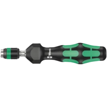 Destornillador dinamométrico de Wera. Un ajuste del par de giro variable con altísima precisión del valor. El ajuste del valor del par de giro necesario es muy descomplicado y se puede realizar sin herramienta auxiliar. La escala de valores se puede leer muy fácilmente. Dispone de una señal de "clic". La tecnología Rapidaptor de cambio rápido permite un cambio ultrarrápido de las puntas. El par de desapriete es ilimitado para poder soltar tornillos fuertemente agarrotados. Con un mango Kraftform multicomponente que dispone de una zona dura y una zona blanda para alcanzar altas velocidades de trabajo y, al mismo tiempo, cuidar la palma de la mano del usuario. Adecuado para puntas con arrastre hexagonal exterior de 1/4" según la norma DIN ISO 1173-C 6,3 y E 6,3 (ISO 1173).