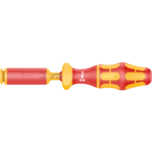 Porta-puntas manual dinamométrico VDE para un trabajo seguro hasta los 1000 voltios. Con un valor del par de giro ajustable de entre 0,3 y 1,2 Nm. Un sobre-encastre claramente audible y palpable tan pronto se alcanza el valor del par de giro preajustado. Un par de desapriete manual ilimitado. Para varillas tipo Kraftform Kompakt VDE: el sistema de mango y varillas intercambiables permite un cambio ultrarrápido de la varilla que se necesita, y ofrece así múltiples formas de aplicación.