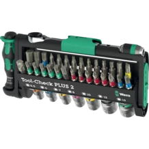 De 39 piezas. Un juego de herramientas supercompacto para el uso tanto manual como mecánico. Los elementos de bloqueo de color verde del Tool-Check sostienen las herramientas durante el transporte de forma segura. Incluye una carraca de puntas de 1/4", en versión de acero macizo forjado en estampa. El mecanismo de dientes finos (con 60 dientes) permite un ángulo de retorno mínimo de 6° para trabajos de precisión. La conmutación derecha/izquierda es muy simple. Tanto la cabeza como la palanca de la carraca tienen una forma ergonómica. Con ayuda del adaptador 870/1 de Wera que incluye el juego (de hexágono exterior de 1/4" a cuadradillo exterior de 1/4"), también es posible utilizar vasos de 1/4". 7 insertos de llaves de vaso Zyklop (de 1/4", para el uso manual y mecánico); con ranura de captación de bolas. El moleteado en el extremo posterior permite un buen agarre al atornillar en trabajos manuales. Lleva el sistema de búsqueda de herramientas Take it easy: con marcas a color según el tamaño - para encontrar la herramienta precisa de manera simple y rápida. Fabricación de cromo-vanadio en cromado mate. 28 puntas, en version BTZ con zona BiTorsion (evita una rotura prematura de la punta) y sistema de búsqueda de herramientas Take it easy: con marcas a color según perfil y tamaño, versión resistente y dura (Z) para el uso universal, ranura en cruz Phillips, TORX®, TORX® BO, ranura y cuadradillo interior. Viene en el Tool-Check supercompacto y práctico.