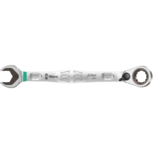 Clé mixte à cliquet Joker coudée côté cliquet et à levier d'inversion. Avec fonction de retenue assurée par une plaque métallique implantée dans la fourche, réduisant le risque d'égarer vis et écrous. La butée terminale intégrée est à même d'empêcher le glissement vertical hors de la tête de vis et permet le déploiement de couples élevés. La plaque métallique interchangeable située dans la fourche bloque les vis et les écrous grâce à ses dents extra-dures et diminue le risque de ripage. La morphologie dodécagonale engendre une liaison géométrique intime avec la vis ou l'écrou, réduisant le risque de ripage. L'angle de reprise de 30° seulement côté fourche permet d'éviter le retournement laborieux de la clé lors du vissage. e de reprise de 30° seulement côté fourche permet d'éviter le retournement laborieux de la clé lors du vissage. Mécanisme à inversion du cliquet à denture exceptionnellement fine (80 dents) côté œillet, offrant un maximum de souplesse même aux endroits exigus. Précision du mécanisme du cliquet audible au déclic. Le robuste élément d'encliquetage en deux parties assure en outre une extrême stabilité. Côté cliquet coudé à 15° pour des travaux sûrs à couples élevés. Le forgeage à géométrie spécialement étudiée assure une transmission de couple élevée et une haute résistance à la flexion. Réalisation en acier chrome-molybdène performant, avec revêtement nickel-chrome pour une haute tenue à la corrosion. Avec repéreur d'outils Take it easy d'identification des tailles par couleur.