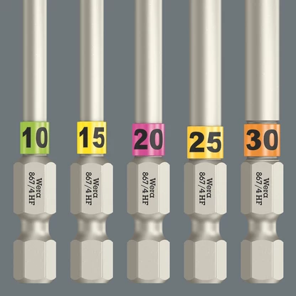 Selon la taille, les embouts 867 TORX® HF portent des bandes de couleurs différentes et l'empreinte indiquant la taille. Cela permet de toujours trouver rapidement l’embout nécessaire.