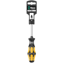 Tournevis-burin Wera pour visser, buriner, mortaiser et desserrer les vis bloquées. Avec manche Kraftform multicomposant pour un travail rapide et en douceur. Kraftform Plus : les zones dures permettent une vitesse de travail élevée alors que les zones tendres garantissent la transmission de couples élevés. Avec lame hexagonale traversante en matériau pour embouts d'où une transmission de force sans déperdition, même sous les coups de marteau. La finition extra-rigide du matériau empêche l'éclatement ou la rupture de la lame. Avec zone de frappe intégrée, pour une longévité accrue et une diminution du risque d'éclats. Le plot hexagonal intégré permet de transmettre des couples plus élevés avec une clé à fourche ou polygonale. La pointe Wera Black Point, conjuguée à un procédé de trempe sophistiqué, garantit une grande longévité, une protection anticorrosion accrue et un ajustement parfait. La forme hexagonale du manche empêche ce dernier de rouler sur le plan de travail.
