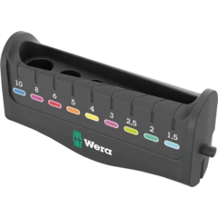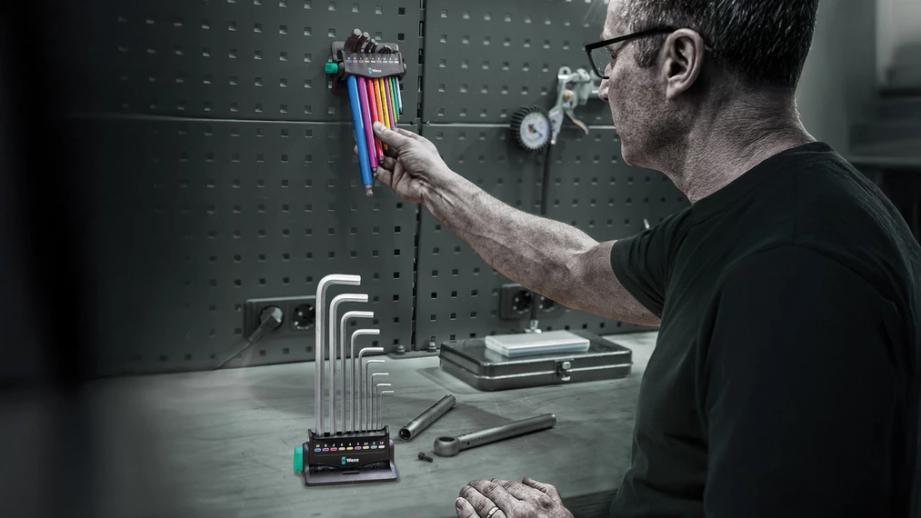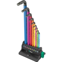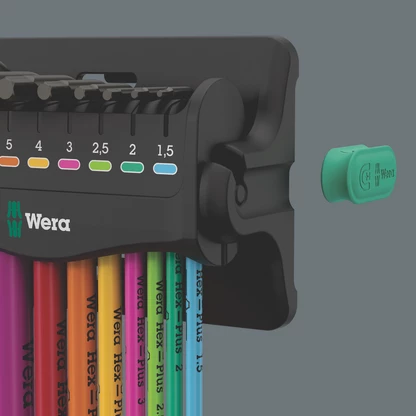 9 clés coudées avec gainage plastique (SPKL) en matériau circulaire facilitant la préhension. Le gainage, qui préserve les mains, rend le travail agréable, même à basse température. Toutes les clés sont faciles à repérer grâce au code couleur et à l'indication de la taille. Rangement pratique dans le rack 9109 à poser sur la table ou à fixer au mur. Clip 9539 intégré au rack pouvant être retiré pour les interventions mobiles. Le rack contient également un astucieux bloc de magnétisation 9538 amovible permettant de magnétiser (et démagnétiser) les vis et pointes d'outils ; il n'est donc plus nécessaire de maintenir la vis avec la deuxième main.