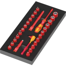 Insert en mousse durable ; bicolore pour repérer rapidement les pièces manquantes ; compatible avec les servantes d'atelier Tool Rebel. Comprend : 1 cliquet Zyklop 8007 A VDE avec levier d'inversion (1/4"), 12 douilles Zyklop 8790 A (1/4"), 7 douilles-embouts Zyklop 8767 A HF (1/4") avec fonction de retenue pour vis TORX®, 5 douilles-embouts Zyklop 8740 A HF (1/4") avec fonction de retenue pour vis à six pans creux, 2 rallonges Zyklop (1/4", 8794 LA VDE (150 mm de long), 8794 SA VDE (91 mm de long)), 1 manche VDE 817 VDE avec admission hexagonale de 9 mm pour les lames interchangeables Wera Kraftform Kompakt VDE, 1 lame/adaptateur Kraftform Kompakt A VDE 712 i, hexagone mâle 9 mm vers carré mâle 1/4", permettant d'utiliser aussi les douilles et douilles-embouts 1/4" avec le porte-embouts 817 VDE. Tous les outils sont contrôlés pièce à pièce selon la norme IEC 60900. Cela garantit un travail en toute sécurité sous tension jusqu'à 1 000 volts.