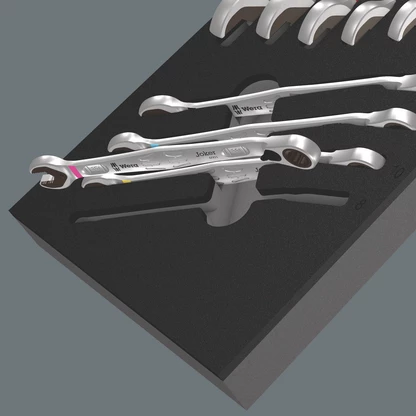 Insert en mousse durable ; bicolore pour repérer rapidement les pièces manquantes ; compatible avec la servante d'atelier Tool Rebel. Comprend 11 clés mixtes à cliquet avec levier d'inversion 6001 Joker Switch.