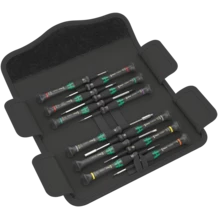 Jeu de tournevis haute qualité Wera Micro, pour vissages en mécanique de précision. La crête pivotante servant d'appui à la main et la zone de rotation rapide située juste en-dessous permettent un "tortillement" très rapide. Le repositionnement fastidieux de la main n'a plus lieu d'être. La zone de puissance, incluant des zones tendres, permet la transmission de couples de serrage/desserrage élevés, la zone de précision garantissant quant à elle le bon angle de rotation lors des travaux d'ajustage. La pointe Wera Black Point offre un parfait ajustement et une protection optimisée contre la corrosion. Avec rack très pratique pour un rangement clair des tournevis.