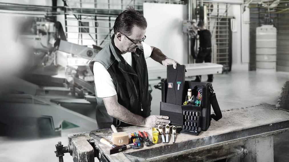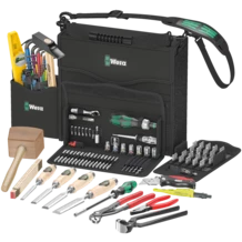 Jeu d'outils compact comprenant les 134 outils les plus importants pour le travail du bois avec des produits Wera, BESSEY®, "KIRSCHEN"®, KNIPEX®, Lyra®, PICARD® et Stabila®. La valise porte-outils compacte du système Wera 2go facilite nettement la mobilité.